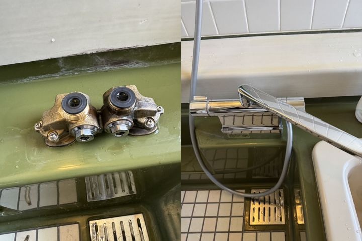 まず止水を行い、サーモスタット水栓を偏心管から慎重に取り外しました。劣化して固くなったパッキンを取り外し、新品のパッキンへ交換。接続部の座面も清掃したうえで再度しっかり組み直し、水漏れが完全に止まっているか通水確認を行いました。