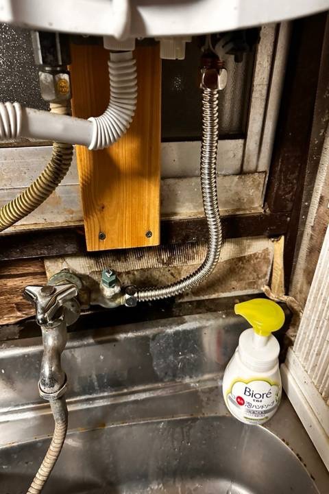 確認すると、蛇口と給湯器をつなぐ給水菅(フレキ管)の根元部分からポタポタと水が漏れていました。接続部のパッキンは劣化しており、金属疲労でフレキ管の曲部にも亀裂が入っていました。経年劣化が重なり漏水につながった典型的なケースです。