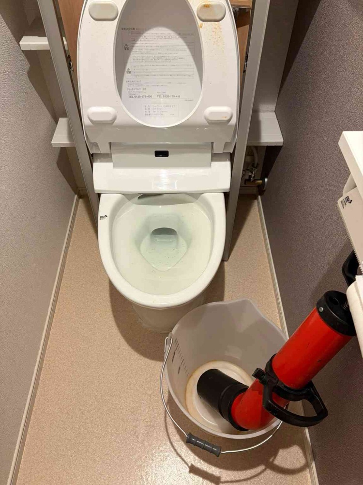 到着時、便器内の水位は高いままで、時間が経っても下がらない状態でした。お客様にお話を伺うと、昨年トイレを新しく交換したばかりとのこと。異物を流した心当たりはなく、短時間に何度も使用した後から流れが悪くなったという状況でした。最新のトイレは節水性能が高く、従来のトイレに比べて使用する水量が大幅に少ないため、紙の量が多いと詰まりが起きやすくなることがあります。