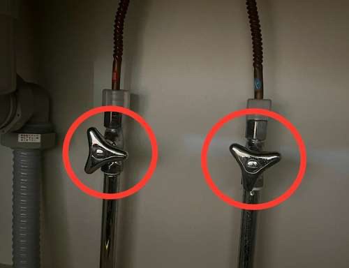 左がお湯側・右が水側で、2箇所の止水栓がありますので、二つとも蛇口を閉めるようにハンドルを右に回していくと止水が出来ます。