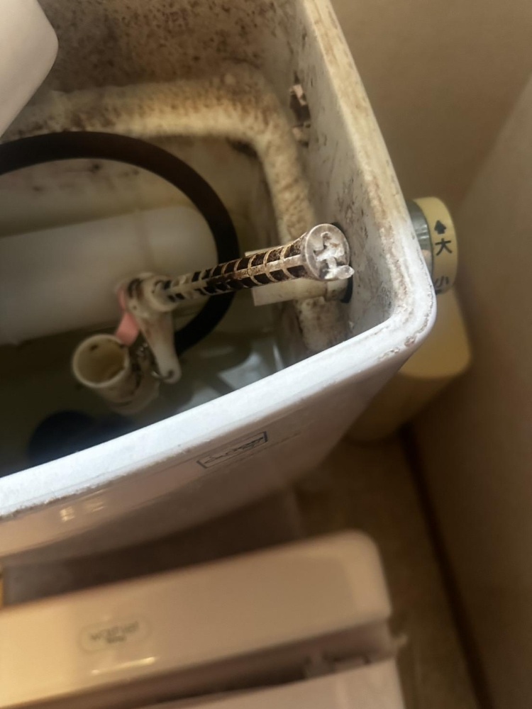 現場でタンク内部を確認すると、レバー軸の樹脂パーツが根元から折れ、回しても内部を動かせない状態 になっていました。樹脂製レバーは経年により脆くなり、特に10年前後使用しているトイレではよく発生するトラブルです。
