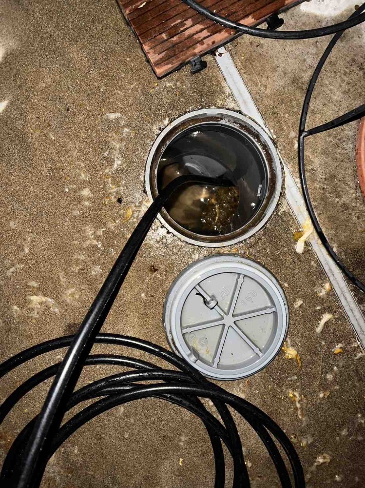 数回目のポンピングで水位がスッと落下。排水音も正常に戻り、滞留した固まりが完全に抜けたことを確認しました。